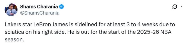 北京时间10月10日,据名记Shams报道,湖人球星詹姆斯因右侧坐骨神经痛,将至少休战3至4周。这意味着他将缺席2025-26赛季的赛季初段比赛,预计无缘对勇士的揭幕战。这将是詹姆斯职业生涯中首次缺席赛季揭幕战。