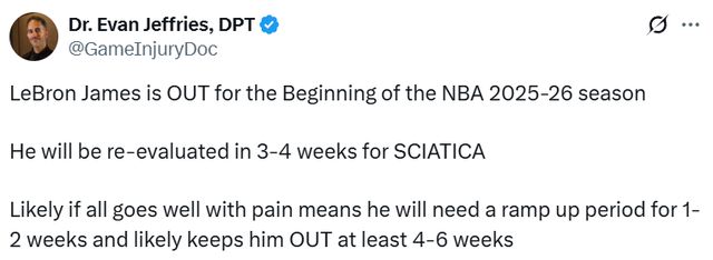 即将开启个人NBA历史第23个赛季的詹姆斯,将因这次伤病,被迫缺席球队的新赛季开局的比赛。湖人队表示,未来3至4周内不会对他的伤情进行重新评估。